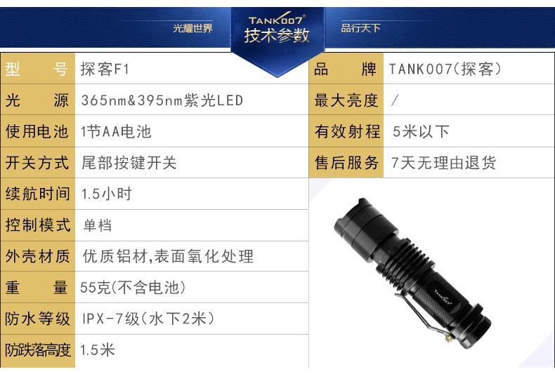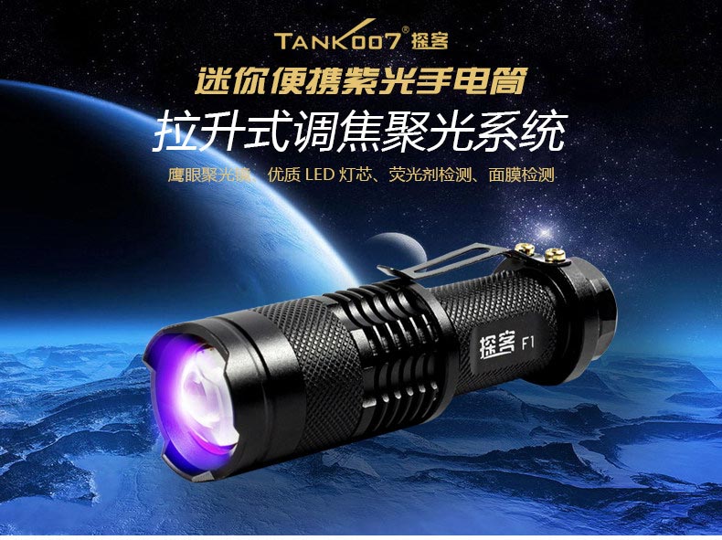 F1家用迷你便攜式紫外線手電筒,具有調(diào)焦聚光功能,可檢測生活中的熒光劑。