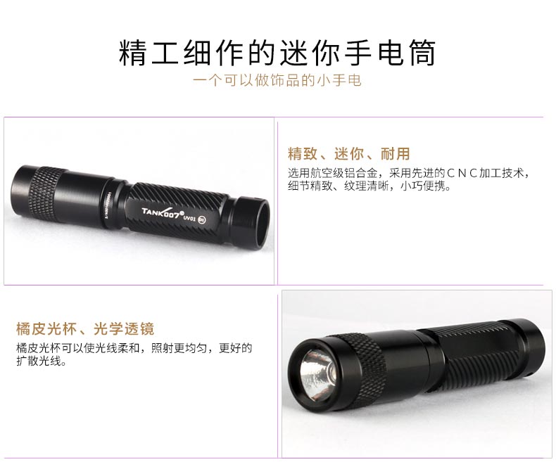 TANK007探客UV01熒光劑檢測365nm紫外線手電筒:1.UV01是一款便攜式迷你日用UV手電筒,使用一節(jié)AAA電池2.配合鑰匙扣可以方便掛于鑰匙串上隨身攜帶