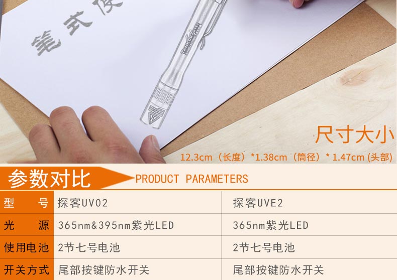 1. UV02是一款便攜式迷你筆帽式UV紫光手電筒,使用兩節(jié)AAA電池。雙向抱夾及筒身滴水紋設(shè)計(jì),不僅方便攜帶也美觀大方。