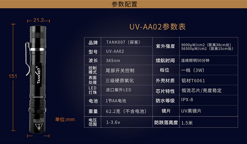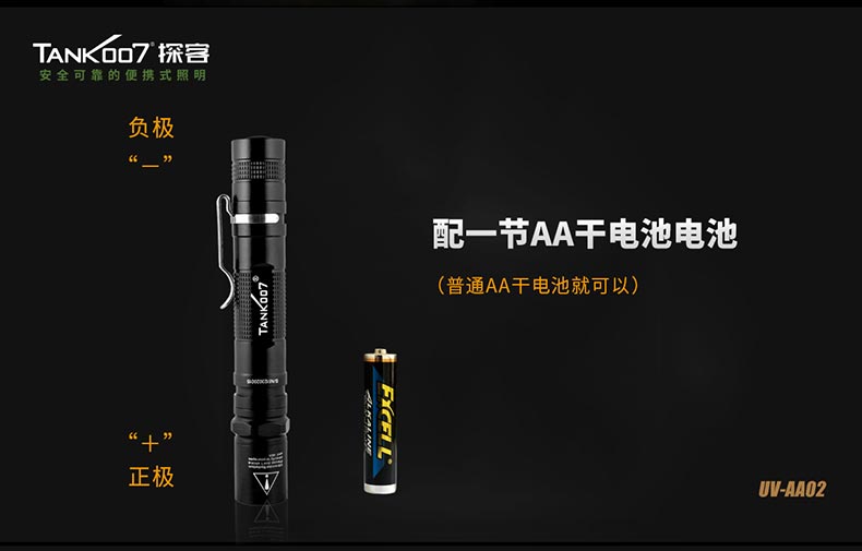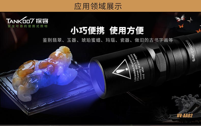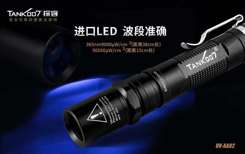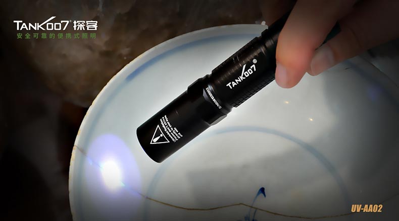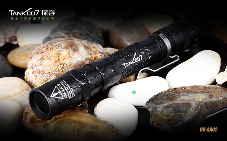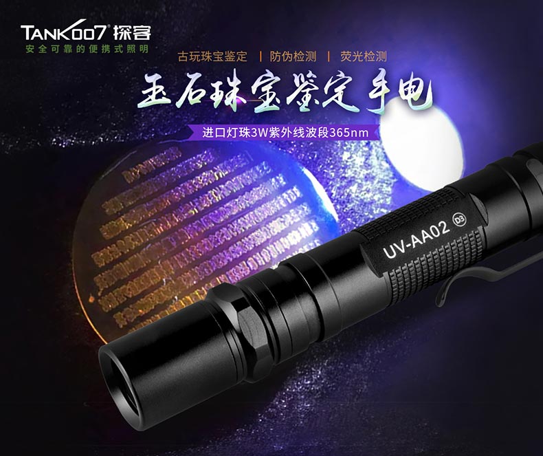 TANK007探客UV-AA02膠水固化/玉石鑒定充電紫外線手電筒:采用18650可充電鋰電池,適用于獵奇尋寶、古董鑒定和尋礦野外探察、油墨固化、UV膠水固化、防偽標識、鈔票辨真等特殊物質(zhì)的熒光反射。