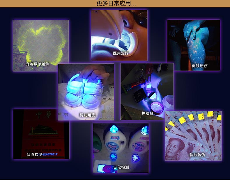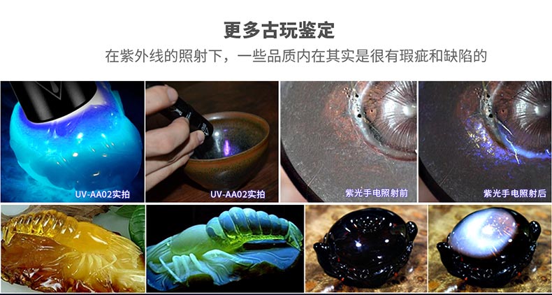 UV-AA02適用于獵奇尋寶、古董鑒定和尋礦野外探察、油墨固化、UV膠水固化、防偽標識、鈔票辨真等特殊物質(zhì)的熒光反射