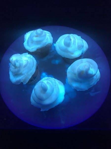 在制作紙杯蛋糕的過(guò)程中,糖霜的制作過(guò)程是非常迅速的,但容易發(fā)生熒光的果凍卻非常耗時(shí)。因此在使用紫外線手電筒照射該不部位時(shí),請(qǐng)?zhí)崆皽?zhǔn)備好果凍的處理。當(dāng)我們?cè)诘案馍现萌霚?zhǔn)備好的果凍后,在紫光燈照射下可以看到熒光反應(yīng),盡管效果不是很明顯,但已經(jīng)讓我們非常驚喜了。